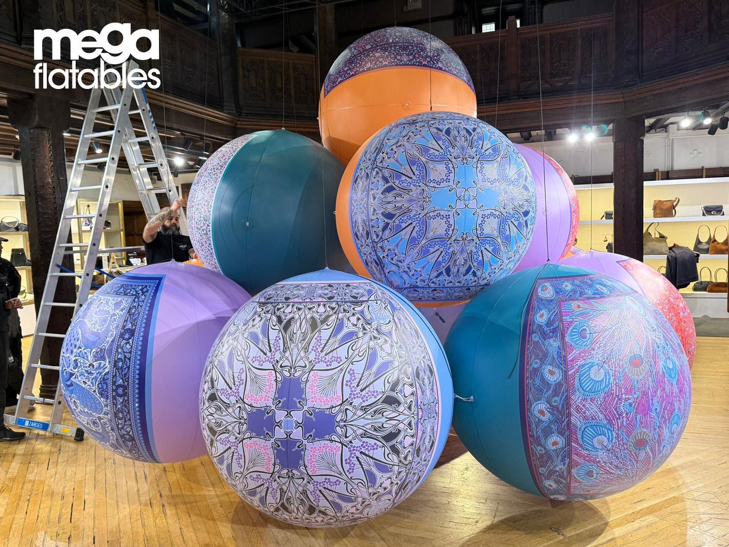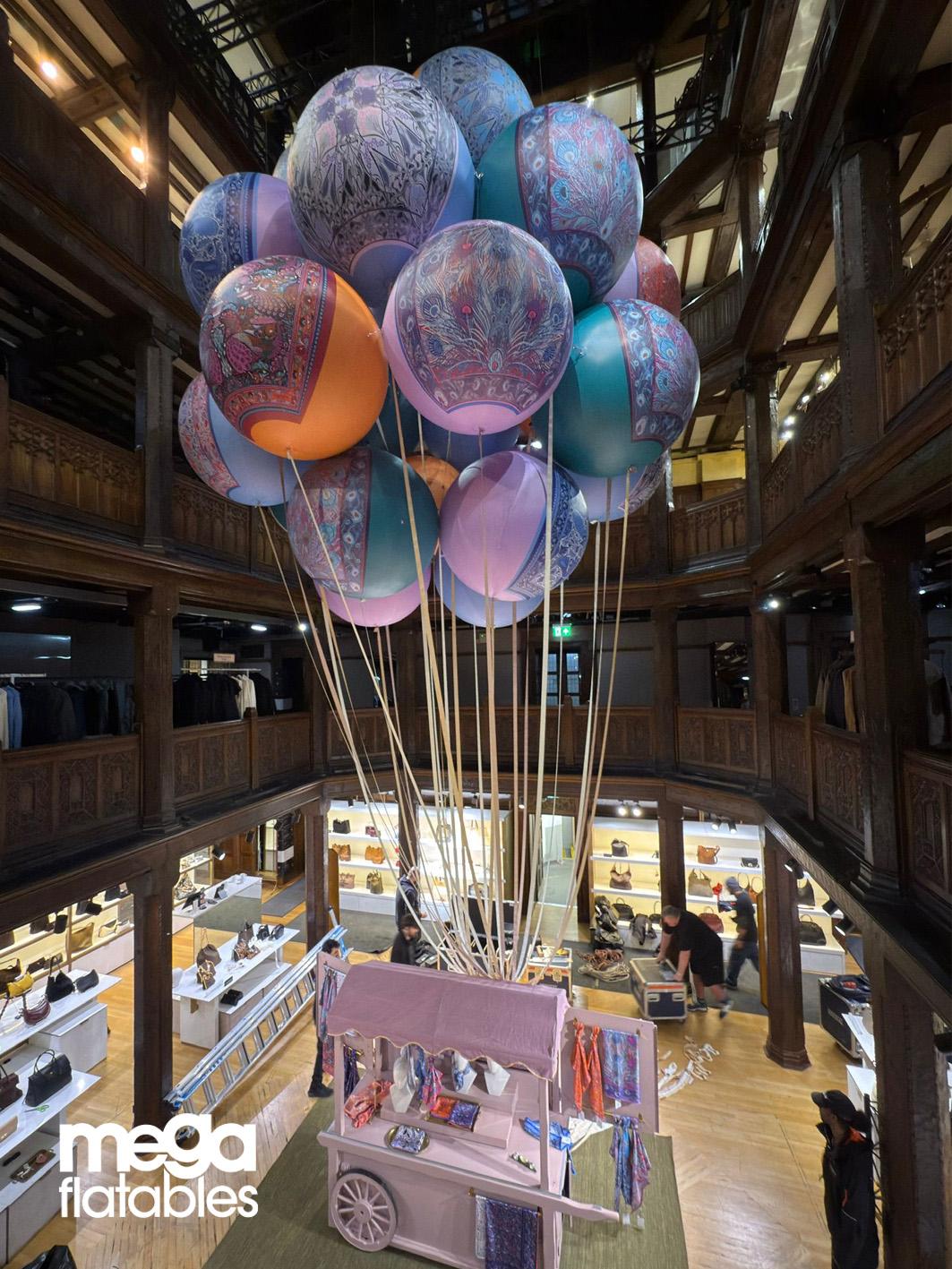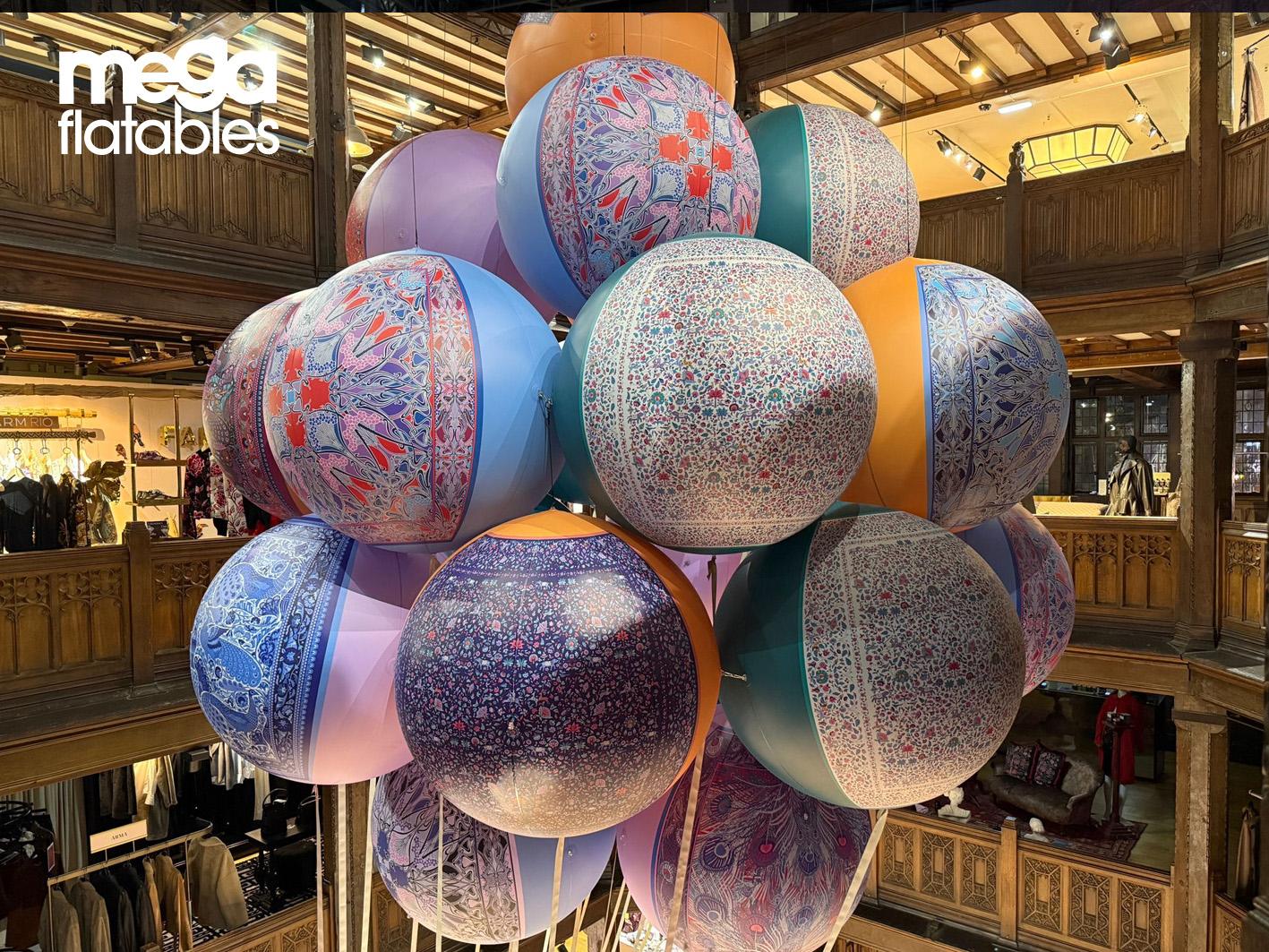 Megaflatables partnered with long-standing client Liberty London to deliver a striking in-store installation featuring custom inflatable spheres printed in Liberty’s iconic scarf designs.